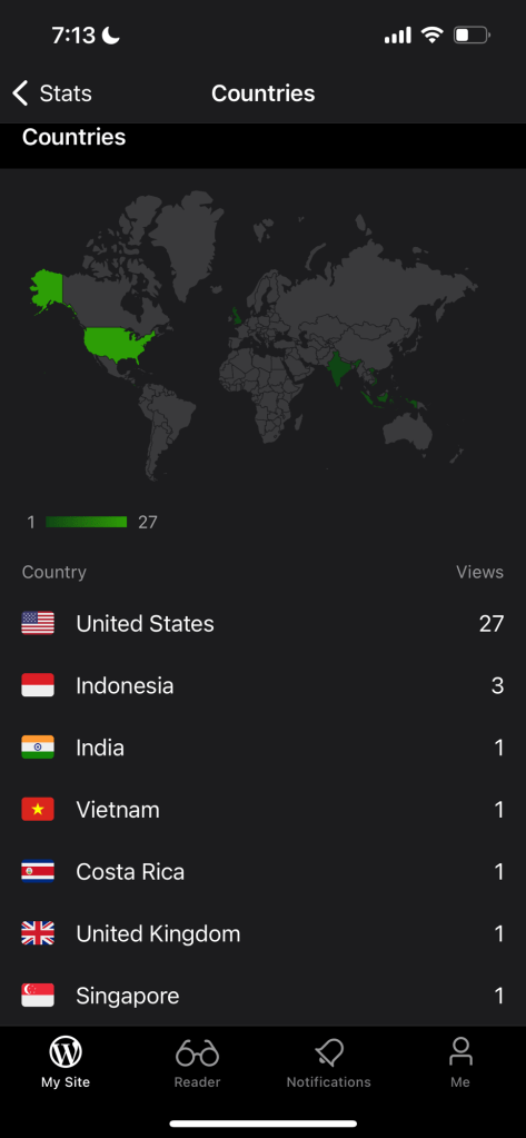 Another cool thing is this stats list. It shows me all the countries my blog has been accessed from. It’s constantly growing throughout my trip as I’ve met new people!